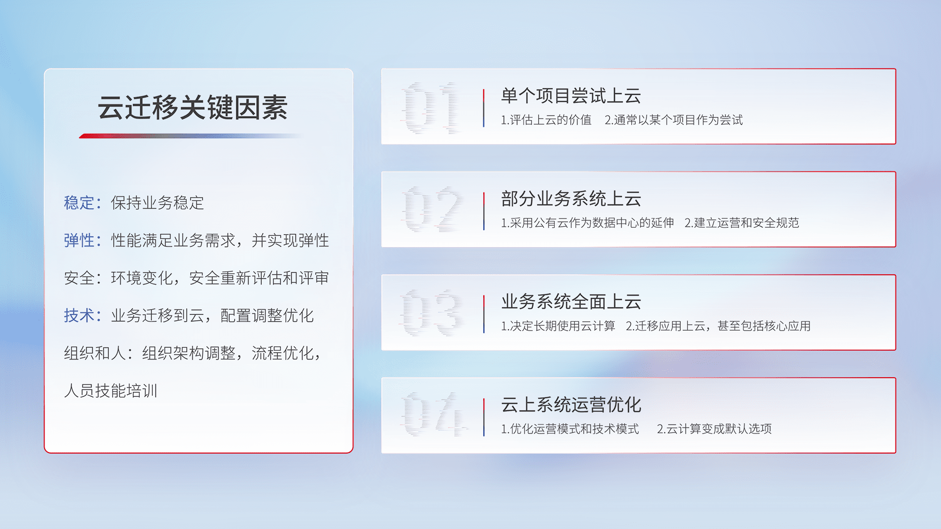 结合实际业务,,,从规划设计、、、、云平台选型、、、、云原生改造、、数据迁移、、、、集成交付,,迁移全过程为客户识别最佳上云路径,,,做好风险识别管理,,设计网络架构、、、、身份权限、、、、安全审计合规、、、操作审计、、、、日志审计、、监控告警策略、、、、多站点容灾设计等,,,,对云上基础设施进行整体规划,,提升IT治理水平,,,以满足弹性、、高可用、、高性能的需求。。。。