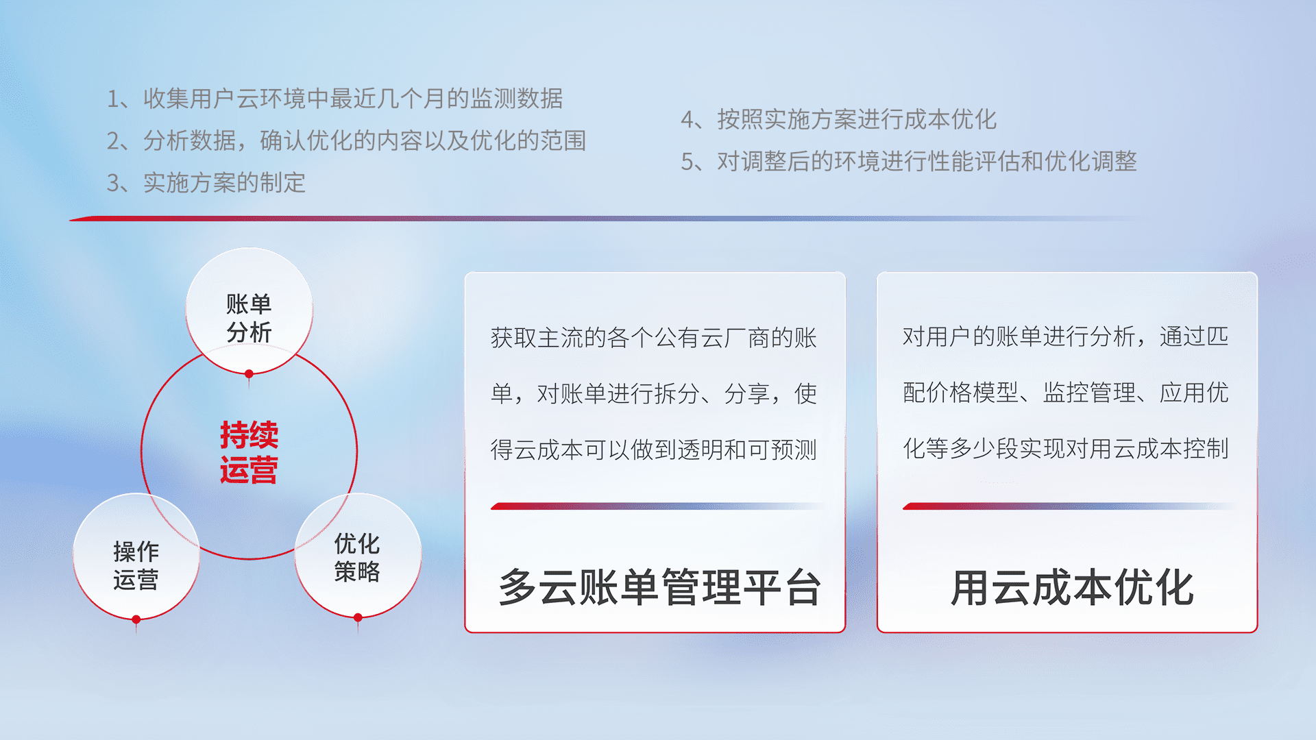 通过多云纳管,,,,以统一的资源数据模型把客户的云资源进行抽象和封装,,进而实现对多云资源的统一操作,,,保障云资源管理的可靠性、、、、稳定性与可用性。。。量身定制化运维内容,,,,配置、、、开发运维、、、补丁管理、、、、备份、、、监控、、、、认证和访问管理、、、审计和日常巡检等,,,保障在用云过程中的可靠度,,,稳定度以及高可用率。。。